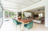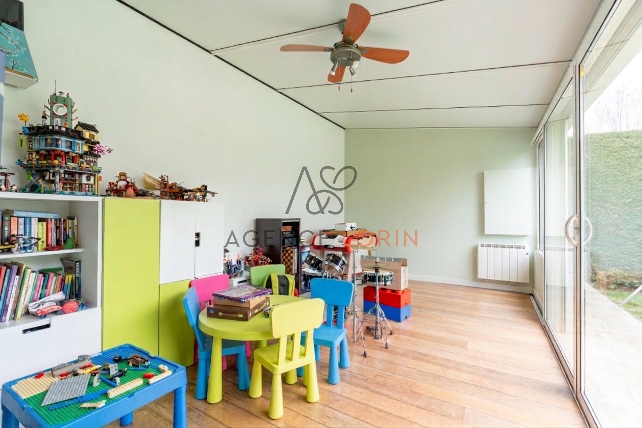 Le rez-de-chaussée offre une triple réception d’environ 80 m² avec cheminée et véranda ouverte sur le jardin, apportant une belle luminosité, ainsi qu’une cuisine équipée. Ce niveau comprend également un salon TV, une salle de sport et une chambre avec salle d’eau et toilettes, idéale pour une suite de plain-pied ou pour recevoir.